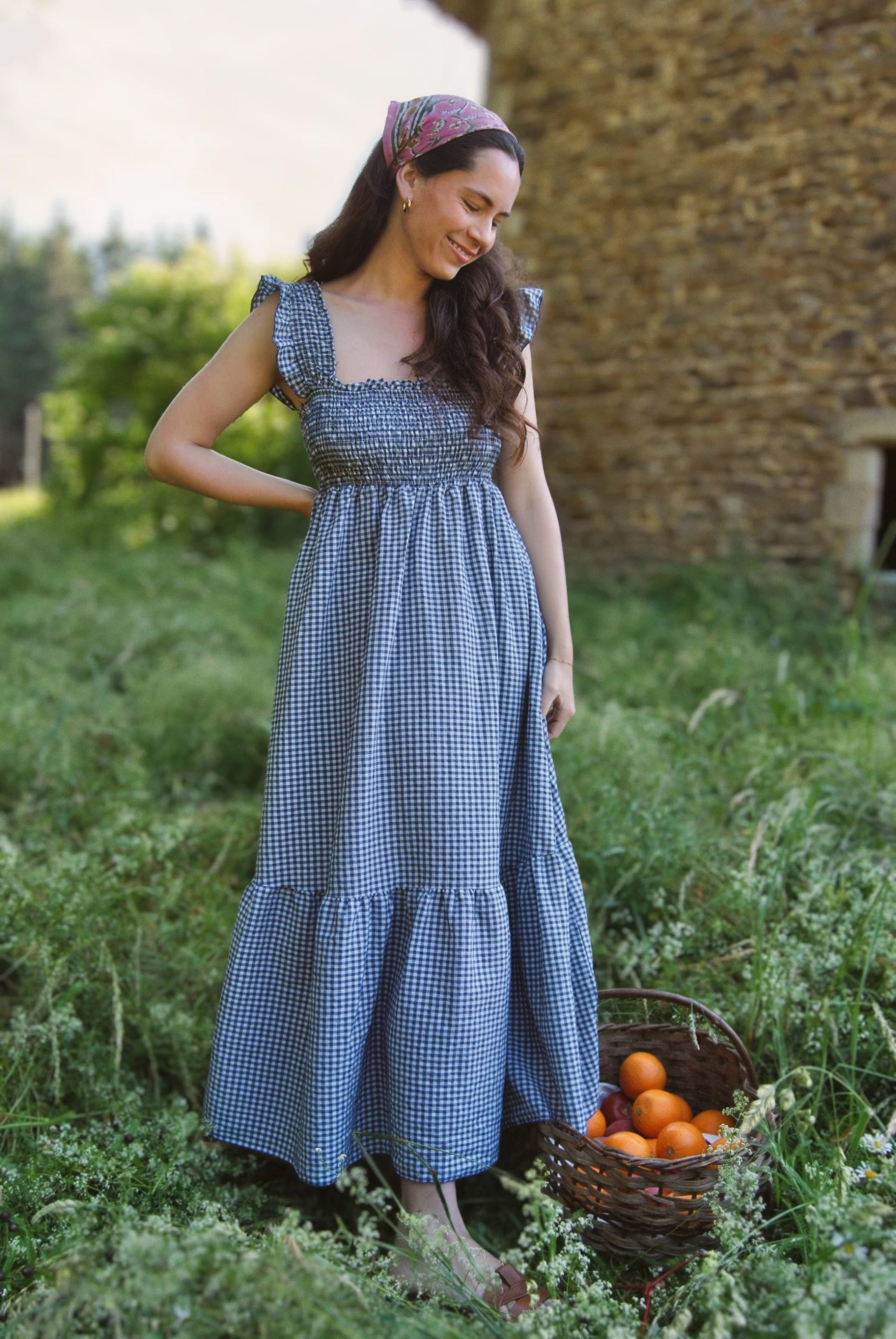 La robe Jeanne incarne le charme bucolique et la féminité simple des beaux jours. Son corsage smocké épouse délicatement la silhouette.